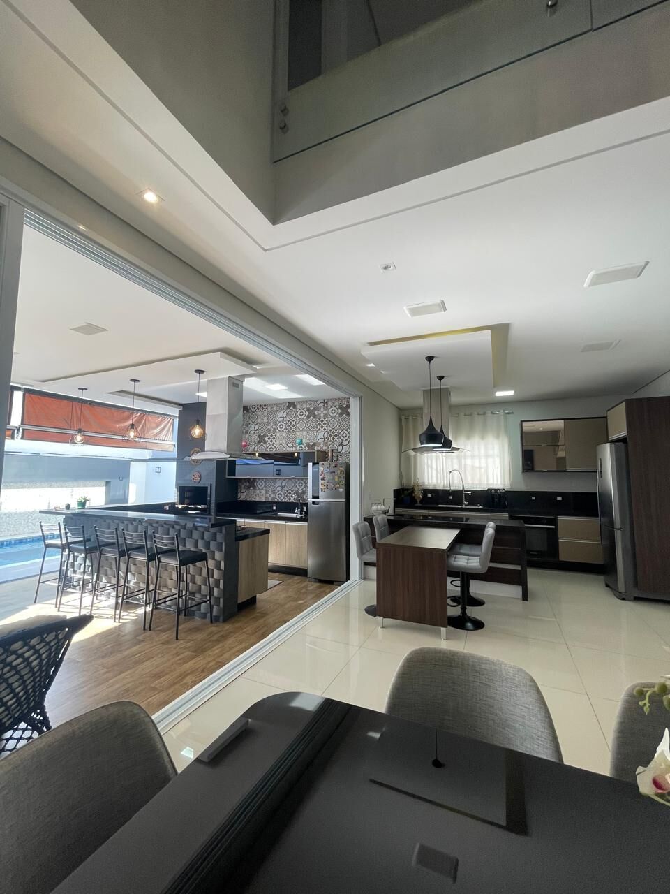 A planta inteligente une sala com pé-direito elevado, área gourmet possui cozinha completa e churrasqueira, além de uma área para socializar com amigos e família na beira da piscina aquecida, um único ambiente fluido e integrado, ideal para receber com estilo ou simplesmente desfrutar do cotidiano com conforto acima do comum. A área conta ainda com banheiro externo com chuveiro, atendendo toda a área da piscina com praticidade.